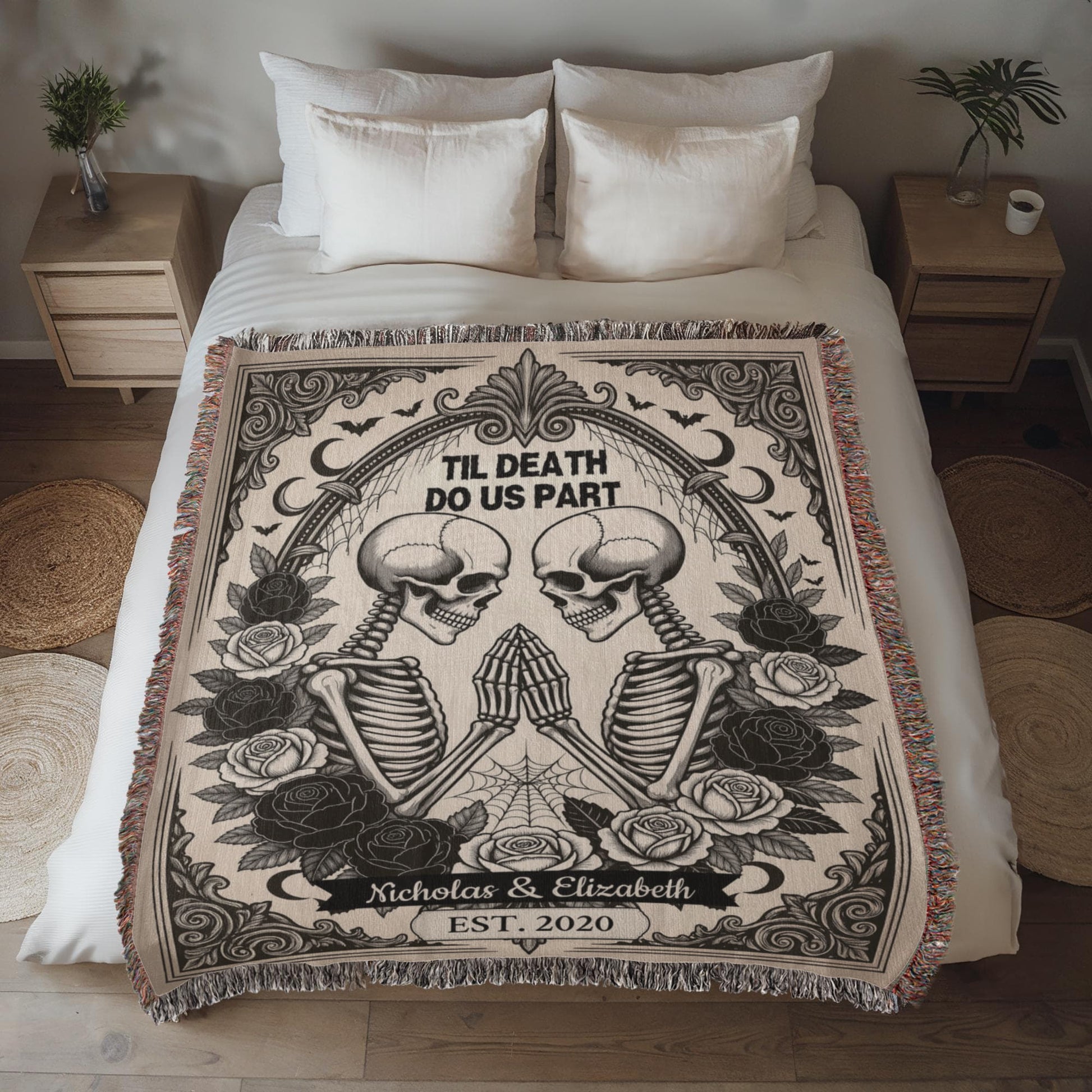 Our “Til Death Do Us Part” Personalized Skeleton Couple Woven Blanket is a hauntingly romantic statement piece designed for couples who embrace love, loyalty, and a little darkness. Blending gothic artistry with heirloom craftsmanship, this woven tapestry celebrates devotion that lasts far beyond this lifetime.